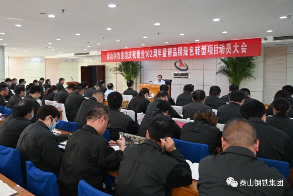 今天的会议室气氛隆重热烈。主席台上方是“泰山钢铁集团庆祝建党102周年暨精品钢绿色转型项目动员大会”会标,后方悬挂着条幅“厉兵秣马 众志成城 万众一心 勇攀高峰”。