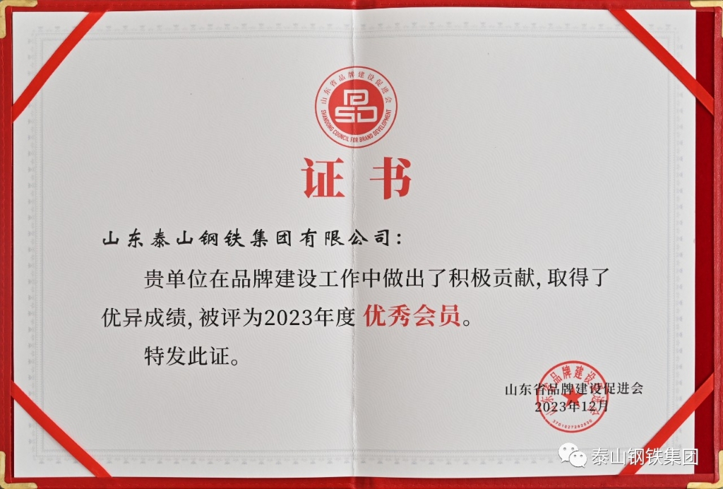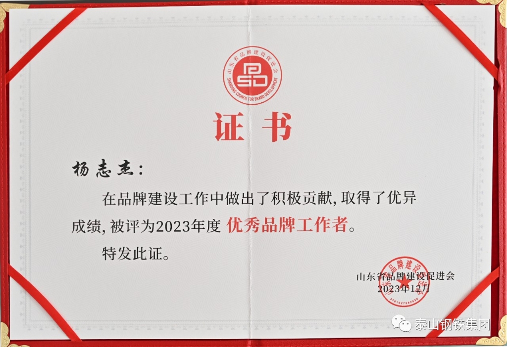 泰山钢铁集团被评为“山东省品牌建设优秀会员单位”,“心博(中国)品牌的创建和发展”被评为“品牌建设优秀案例”,职工杨志杰被评为“优秀品牌工作者”。